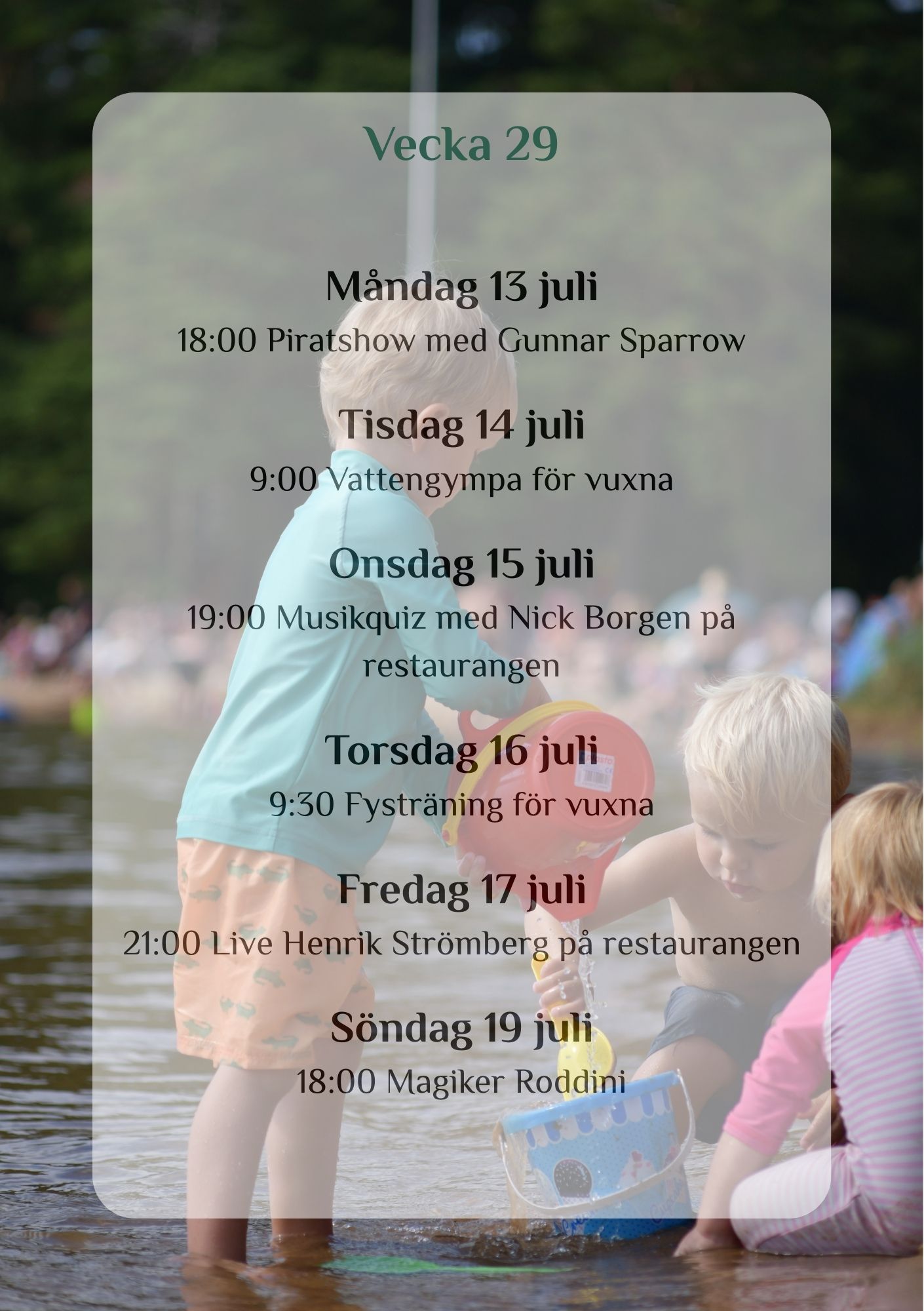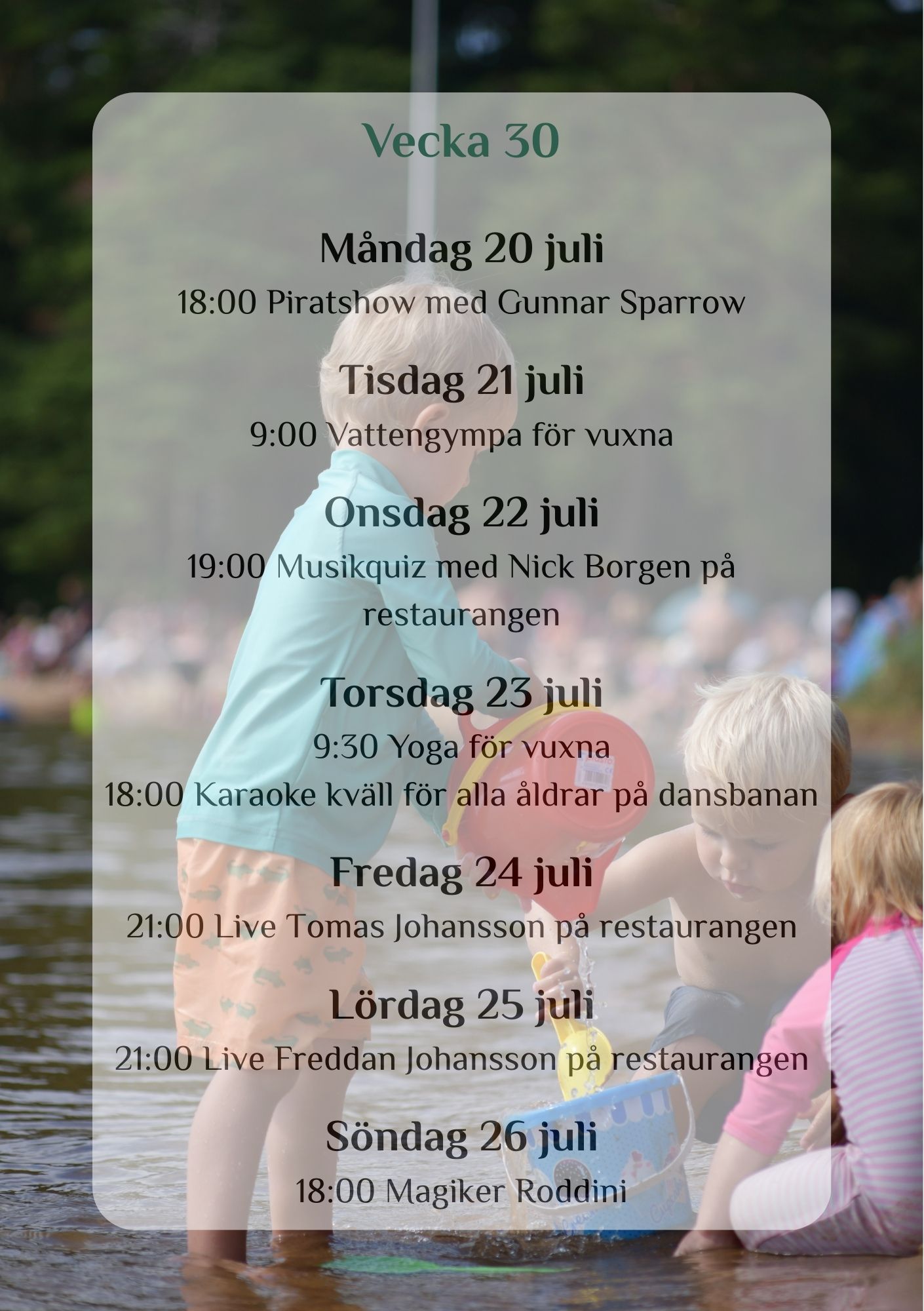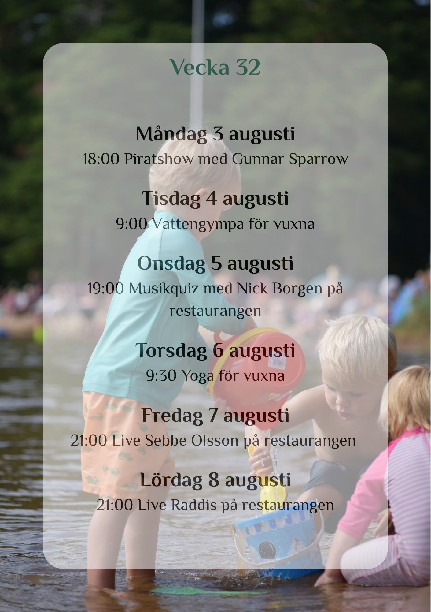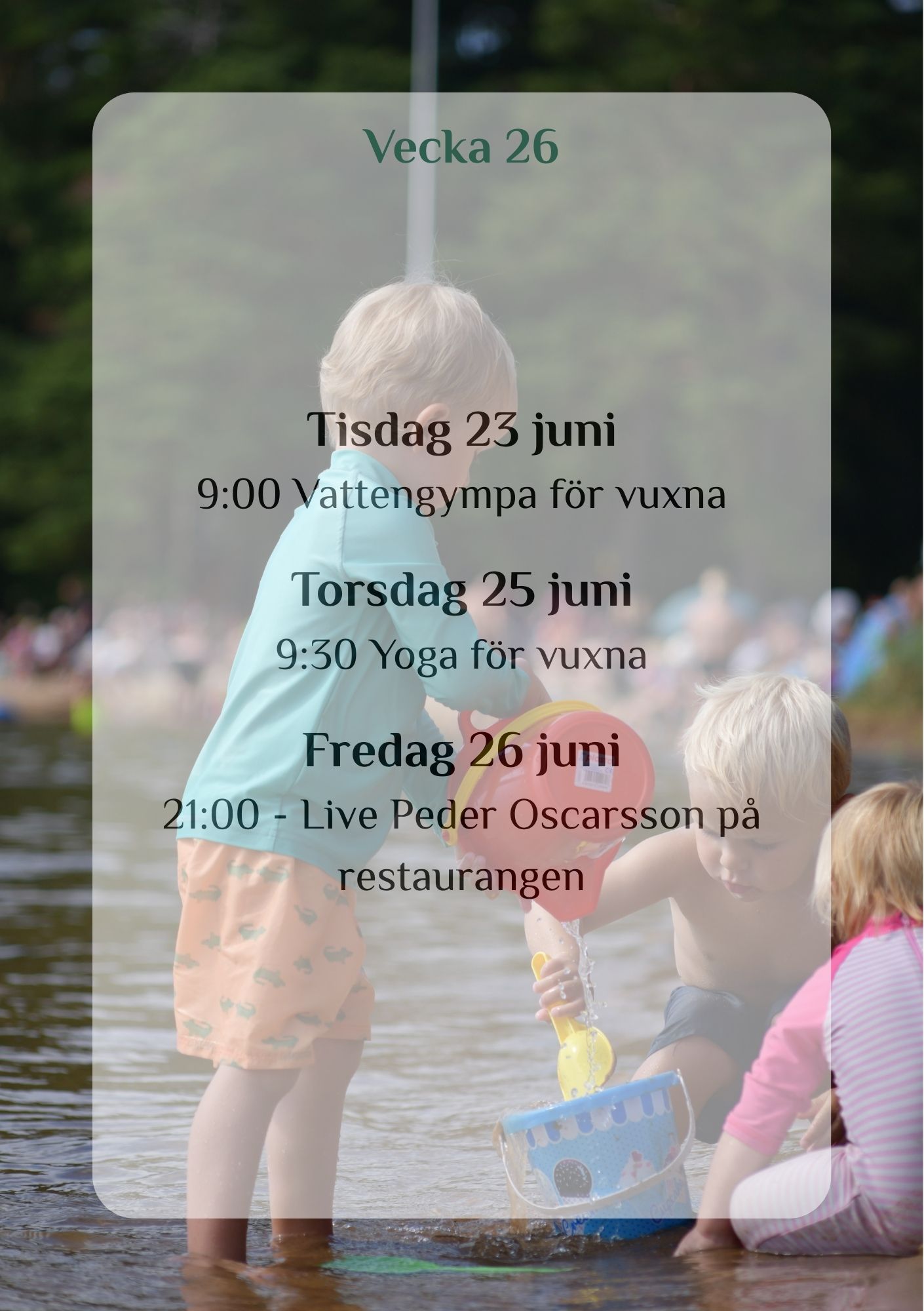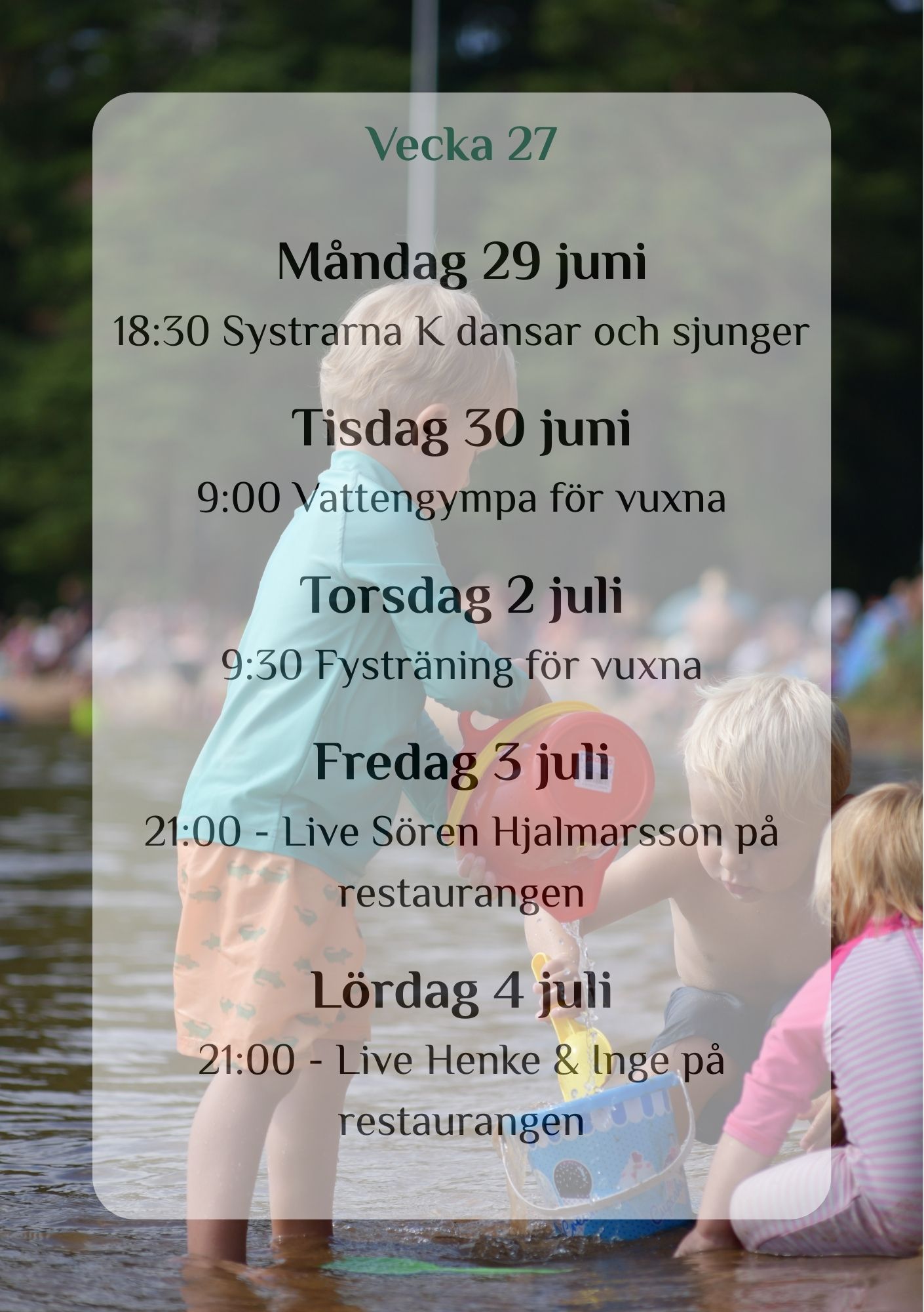 This summer, we are joined by Satnamyoga by Ulrika, offering yoga, water aerobics, and circuit training here at the campsite – from week 26 to…